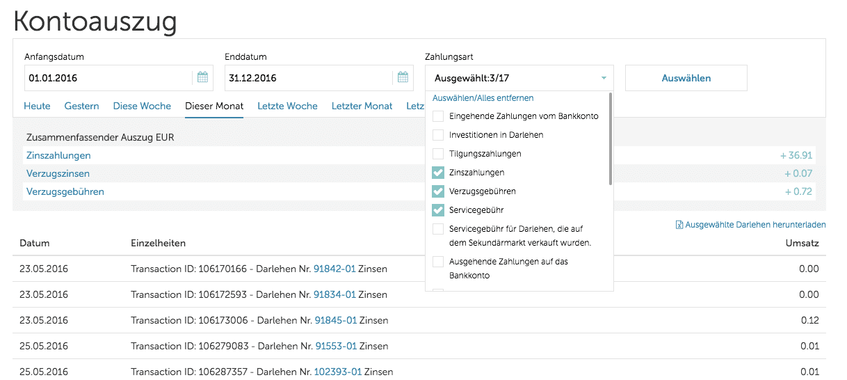 Aber es war hier mal ein Cent, dort mal fünf und anderswo mal zehn. Während der deutsche Anleger bei Auxmoney eine einseitige Erträgnisaufstellung herunterladen kann, muss man sich beim lettischen Anbieter die Zinszahlungen manuell ausdrucken. Das geht zwar ruck-zuck, bedeutet für den Steuerberater und meinen Drucker jedoch mehr Arbeit. Lendico hat mir bis heute noch keine Erträgniserstellung zugeschickt.